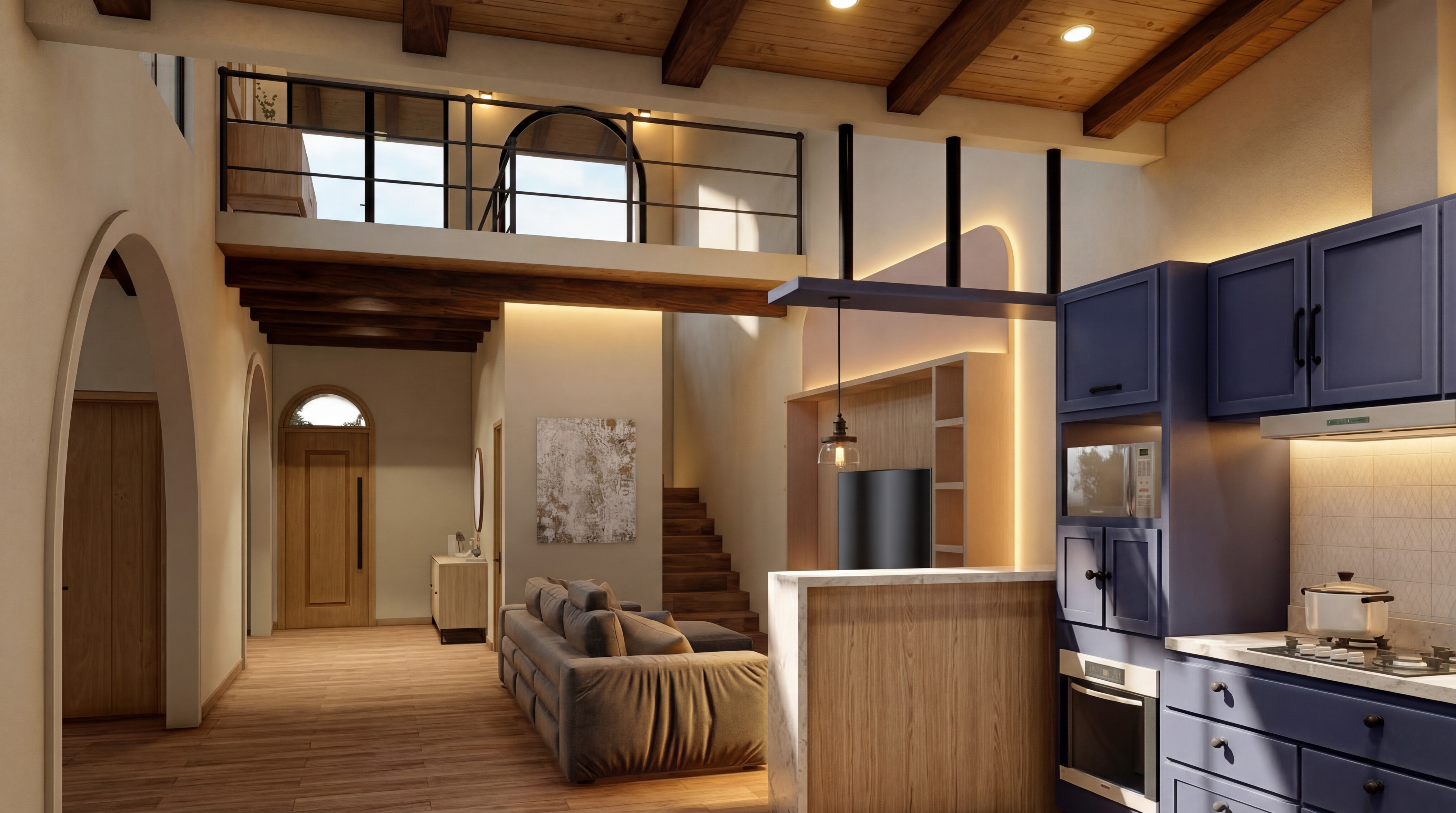 En el interior, la doble altura y las vigas de madera aportan amplitud y carácter al espacio social. La cocina abierta se integra naturalmente con el living y el comedor, creando un ambiente luminoso y funcional para compartir. Cada detalle busca equilibrar estética y comodidad, dando como resultado una casa con personalidad, diseñada para sentirse hogar desde el primer momento.